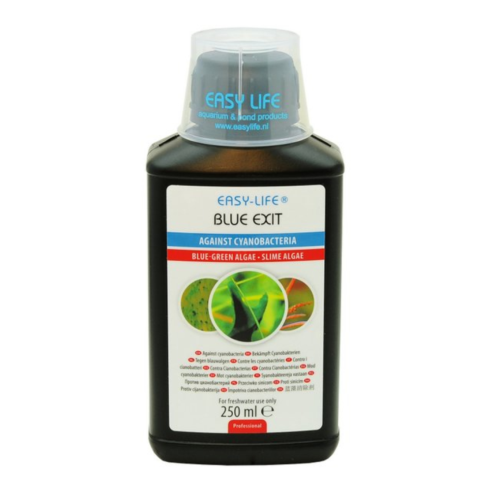 Cyanobacteriën (ofwel blauw-, slijm- of smeeralgen) ontstaan vaak door besmetting, een bacteriehuishouding die uit balans is, een ernstig vervuilde bodem (verrotting) of een te laag nitraat gehalte. Blue Exit bestrijdt Cyanobacteriën resoluut. Blue Exit is eenvoudig en veilig in gebruik en is onschadelijk voor vissen, garnalen, slakken of planten. Als de infestatie groot is, kan een aantal dagen doorgedoseerd worden, zelfs met dubbele doseringen.